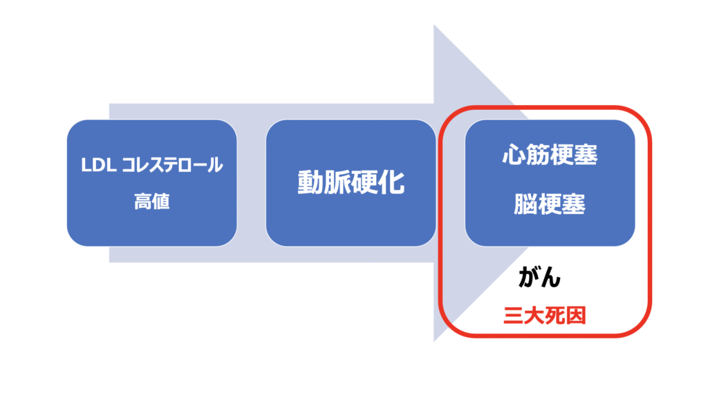 心筋梗塞や脳卒中はがんと並んで、日本人の三大死因です。心筋梗塞や脳卒中は動脈硬化との関係が強く、動脈硬化は高血圧・糖尿病・高コレステロール・タバコがリスクとされています。つまり、長生きするためにはこれらのリスクを下げていくことが有効と考えられます。