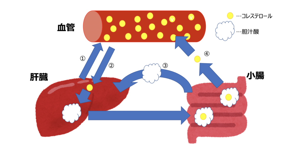 コレステロールを体外へ排泄する働きを促進する薬です。肝臓で生成されたコレステロールの一部は、消化液のひとつである胆汁酸に変わり、消化・吸収を助ける役割を終えたあと、小腸で吸収され再び肝臓に運ばれ再利用され、最終的に排泄されます。